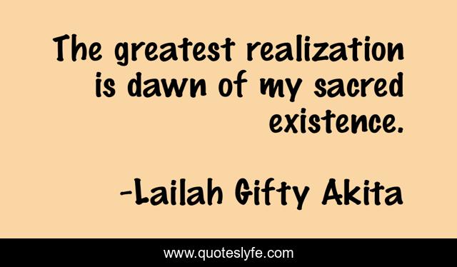This page presents the quote "The greatest realization is dawn of my sacred existence.". Author of this quote is Lailah Gifty Akita. This quote is about life, wise, mission, inspiratonal, purpose,.