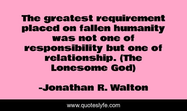 This page presents the quote "The greatest requirement placed on fallen humanity was not one of responsibility but one of relationship. (The Lonesome God)". Author of this quote is Jonathan R. Walton. This quote is about enthusiasm, inspirational, relationship, christianity,.