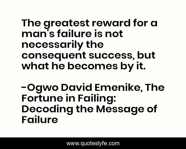 This page presents the quote "The greatest reward for a man's failure is not necessarily the consequent success, but what he becomes by it.". Author of this quote is Ogwo David Emenike, The Fortune in Failing: Decoding the Message of Failure. This quote is about confidence, success, positive, motivational, the-fortune-in-failing, failure, optimistic, inspirational, enthusiasm,.