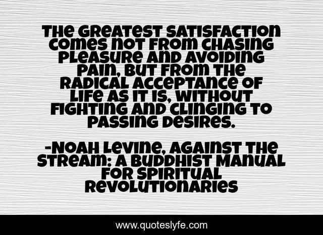 This page presents the quote "The greatest satisfaction comes not from chasing pleasure and avoiding pain, but from the radical acceptance of life as it is, without fighting and clinging to passing desires.". Author of this quote is Noah Levine, Against the Stream: A Buddhist Manual for Spiritual Revolutionaries. This quote is about desire, pleasure, acceptance, pain, satisfaction,.