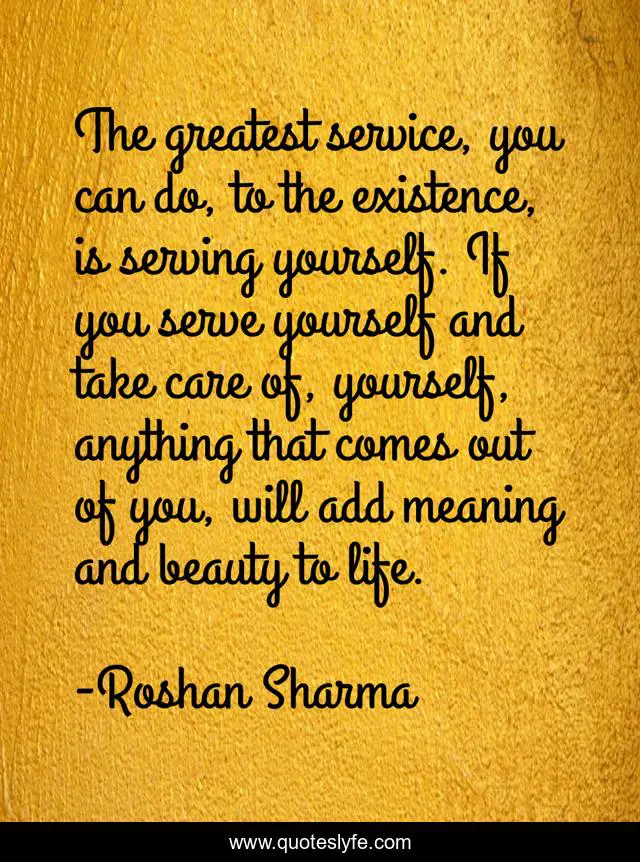 This page presents the quote "The greatest service, you can do, to the existence, is serving yourself. If you serve yourself and take care of, yourself, anything that comes out of you, will add meaning and beauty to life.". Author of this quote is Roshan Sharma. This quote is about quotes, live, insight, learn, mindfulness,.