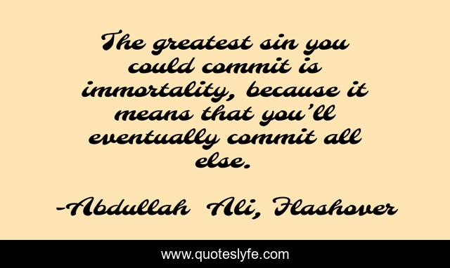 This page presents the quote "The greatest sin you could commit is immortality, because it means that you’ll eventually commit all else.". Author of this quote is Abdullah Ali, Flashover. This quote is about immortality, sin,.