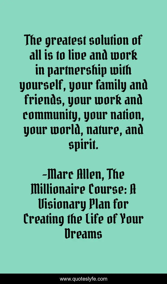 This page presents the quote "The greatest solution of all is to live and work in partnership with yourself, your family and friends, your work and community, your nation, your world, nature, and spirit.". Author of this quote is Marc Allen, The Millionaire Course: A Visionary Plan for Creating the Life of Your Dreams. This quote is about personal-development, entrepreneurship, wisdom,.