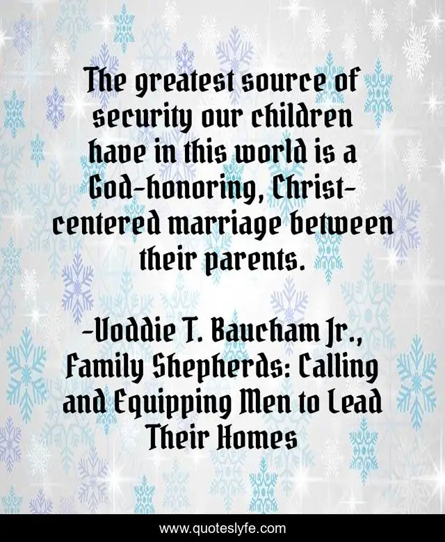 This page presents the quote "The greatest source of security our children have in this world is a God-honoring, Christ-centered marriage between their parents.". Author of this quote is Voddie T. Baucham Jr., Family Shepherds: Calling and Equipping Men to Lead Their Homes. This quote is about parenting, security, marriage, children,.