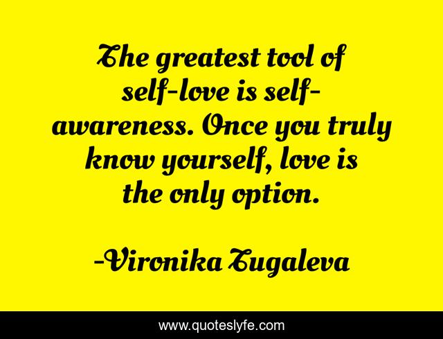 This page presents the quote "The greatest tool of self-love is self-awareness. Once you truly know yourself, love is the only option.". Author of this quote is Vironika Tugaleva. This quote is about self-love, self-awareness, know-thyself, love-yourself, know-yourself, love, self-care, affection, self-esteem,.