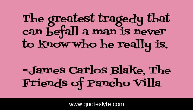 This page presents the quote "The greatest tragedy that can befall a man is never to know who he really is.". Author of this quote is James Carlos Blake, The Friends of Pancho Villa. This quote is about tragedy, first-sentence, self-knowledge,.