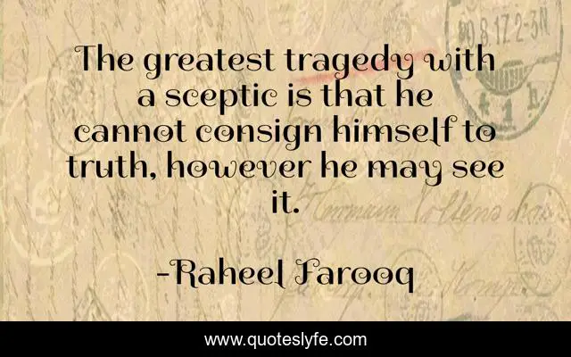 This page presents the quote "The greatest tragedy with a sceptic is that he cannot consign himself to truth, however he may see it.". Author of this quote is Raheel Farooq. This quote is about scepticism, trust, truth, philosophy,.