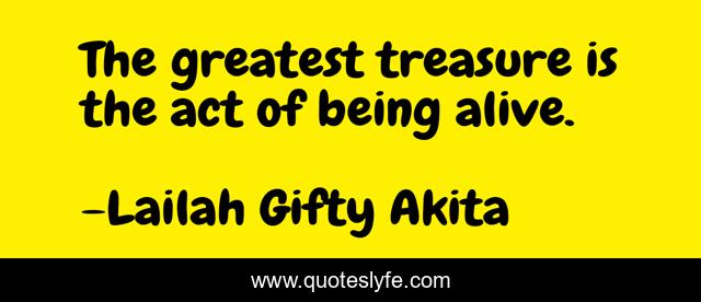 This page presents the quote "The greatest treasure is the act of being alive.". Author of this quote is Lailah Gifty Akita. This quote is about being-alive, inspirational-living,.
