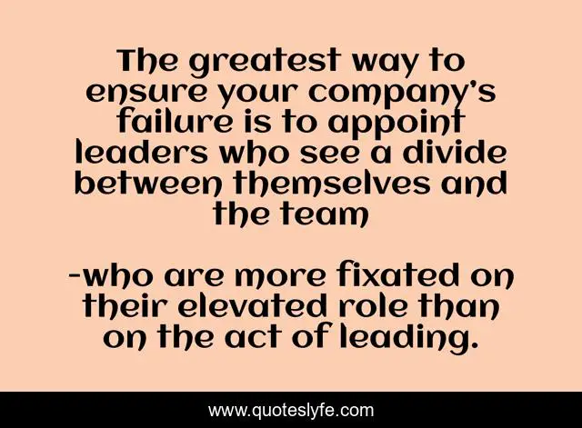 This page presents the quote "The greatest way to ensure your company’s failure is to appoint leaders who see a divide between themselves and the team". Author of this quote is who are more fixated on their elevated role than on the act of leading.. .