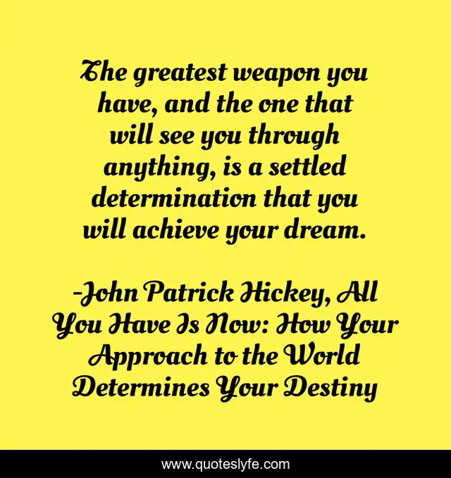 This page presents the quote "The greatest weapon you have, and the one that will see you through anything, is a settled determination that you will achieve your dream.". Author of this quote is John Patrick Hickey, All You Have Is Now: How Your Approach to the World Determines Your Destiny. This quote is about success, personal-growth, action, achievement, personal-development, goal-setting, goals,.