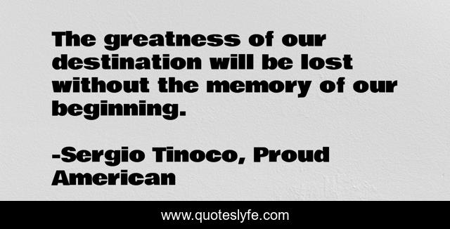 This page presents the quote "The greatness of our destination will be lost without the memory of our beginning.". Author of this quote is Sergio Tinoco, Proud American. This quote is about emotional, inspirational, journey-of-life, enthusiasm,.
