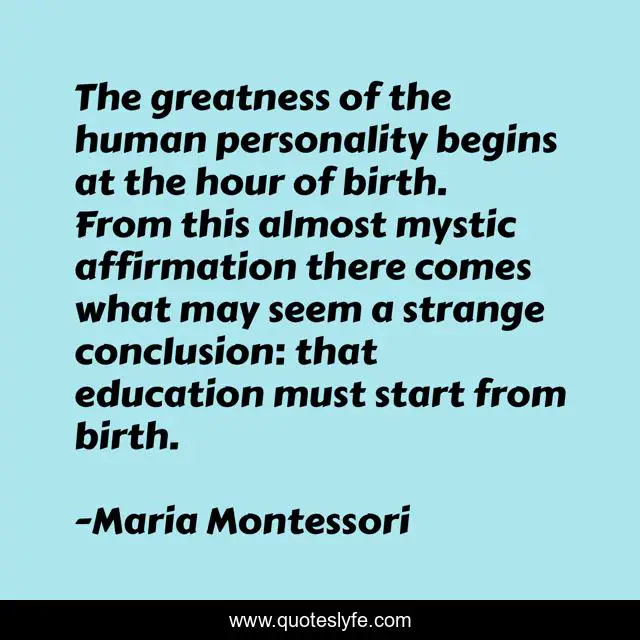This page presents the quote "The greatness of the human personality begins at the hour of birth. From this almost mystic affirmation there comes what may seem a strange conclusion: that education must start from birth.". Author of this quote is Maria Montessori. This quote is about helping, people,.