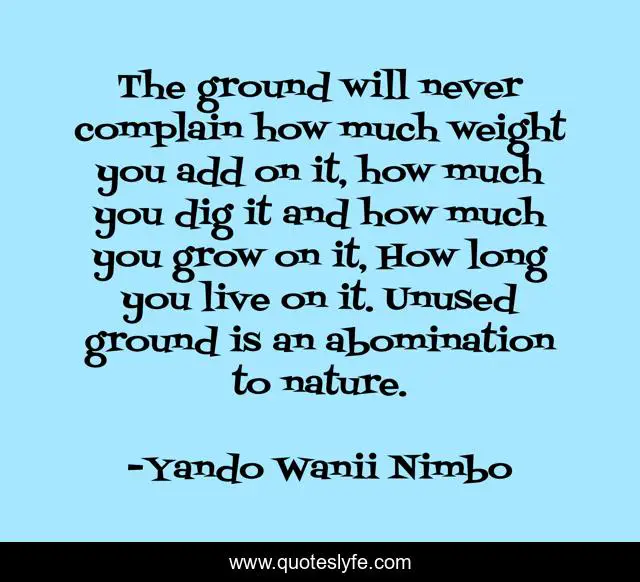 This page presents the quote "The ground will never complain how much weight you add on it, how much you dig it and how much you grow on it, How long you live on it. Unused ground is an abomination to nature.". Author of this quote is Yando Wanii Nimbo. This quote is about poet, orator, ifes-png,.