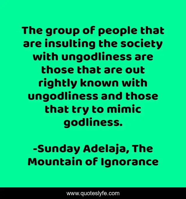 This page presents the quote "The group of people that are insulting the society with ungodliness are those that are out rightly known with ungodliness and those that try to mimic godliness.". Author of this quote is Sunday Adelaja, The Mountain of Ignorance. This quote is about mountain, life, darkness, power, danger, god, people, ignorance, godliness,.