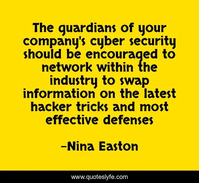 This page presents the quote "The guardians of your company's cyber security should be encouraged to network within the industry to swap information on the latest hacker tricks and most effective defenses". Author of this quote is Nina Easton. This quote is about cyber-security, cybersecurity, security,.