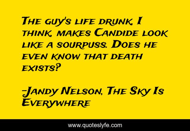This page presents the quote "The guy's life drunk, I think, makes Candide look like a sourpuss. Does he even know that death exists?". Author of this quote is Jandy Nelson, The Sky Is Everywhere. This quote is about witty, humor, lennie-walker,.