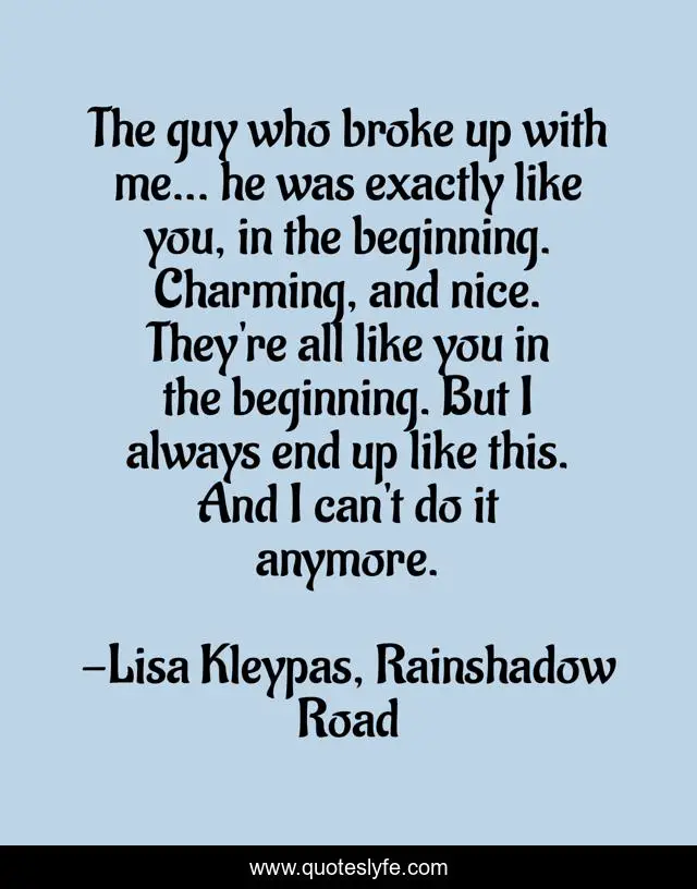 This page presents the quote "The guy who broke up with me... he was exactly like you, in the beginning. Charming, and nice. They're all like you in the beginning. But I always end up like this. And I can't do it anymore.". Author of this quote is Lisa Kleypas, Rainshadow Road. This quote is about broken-hearted, love, affection, loss,.