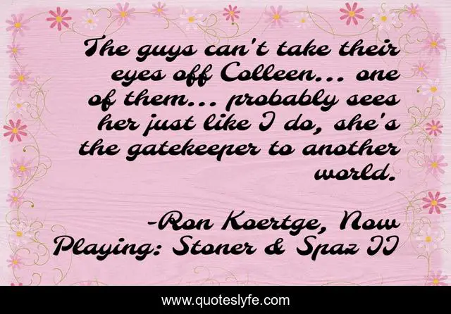 This page presents the quote "The guys can't take their eyes off Colleen... one of them... probably sees her just like I do, she's the gatekeeper to another world.". Author of this quote is Ron Koertge, Now Playing: Stoner & Spaz II. This quote is about teenage-life, puppy-love, admiration, young-adult, infatuation,.