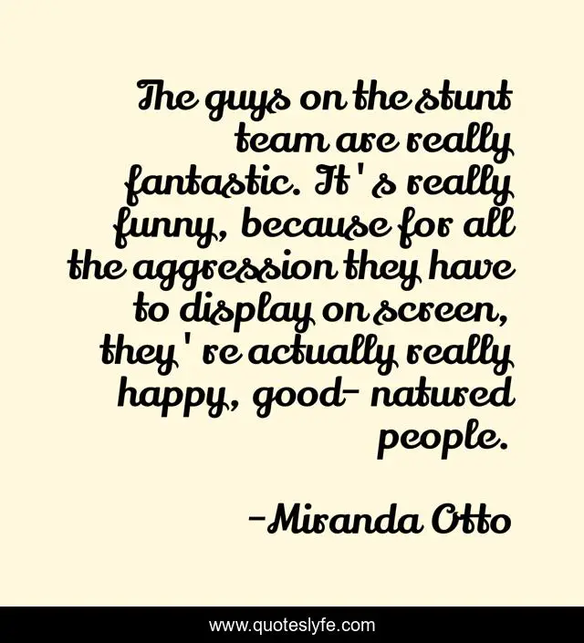 This page presents the quote "The guys on the stunt team are really fantastic. It's really funny, because for all the aggression they have to display on screen, they're actually really happy, good- natured people.". Author of this quote is Miranda Otto. This quote is about happy, good, team,.