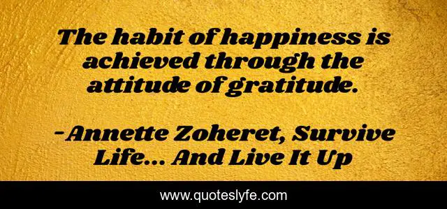 This page presents the quote "The habit of happiness is achieved through the attitude of gratitude.". Author of this quote is Annette Zoheret, Survive Life... And Live It Up. This quote is about gratitude, happiness, positive-thinking,.