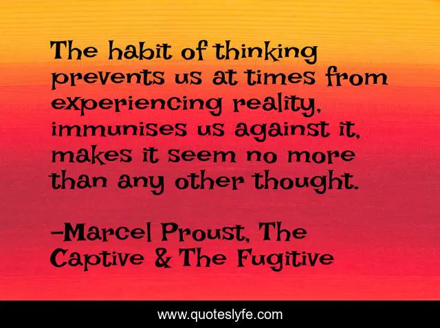 This page presents the quote "The habit of thinking prevents us at times from experiencing reality, immunises us against it, makes it seem no more than any other thought.". Author of this quote is Marcel Proust, The Captive & The Fugitive. This quote is about thinking, habit,.