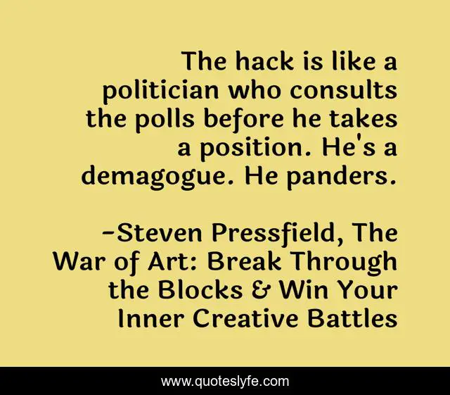 This page presents the quote "The hack is like a politician who consults the polls before he takes a position. He's a demagogue. He panders.". Author of this quote is Steven Pressfield, The War of Art: Break Through the Blocks & Win Your Inner Creative Battles. This quote is about being-true-to-yourself, writers, honesty, truth, artists,.