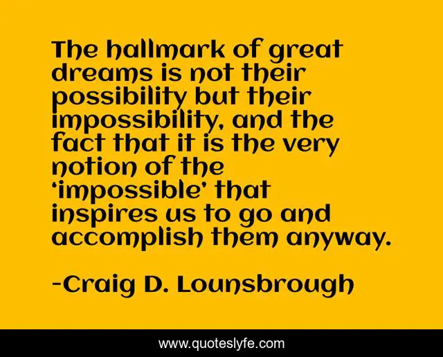 This page presents the quote "The hallmark of great dreams is not their possibility but their impossibility, and the fact that it is the very notion of the ‘impossible’ that inspires us to go and accomplish them anyway.". Author of this quote is Craig D. Lounsbrough. This quote is about inspire, possible, possibilities, aspirations, achieve, goals, hopes, impossible, dreams,.