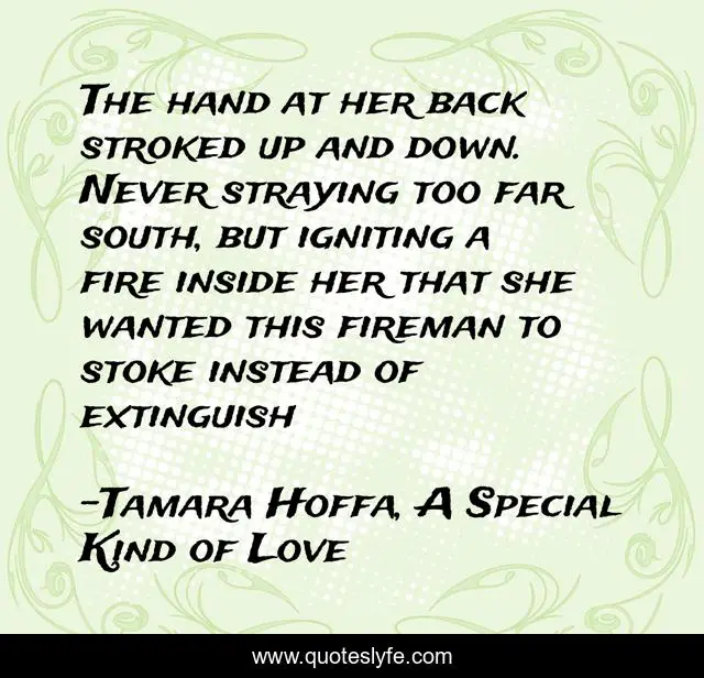 This page presents the quote "The hand at her back stroked up and down. Never straying too far south, but igniting a fire inside her that she wanted this fireman to stoke instead of extinguish". Author of this quote is Tamara Hoffa, A Special Kind of Love. This quote is about contemporary-romance, cowboy, firefighter, multicultural, bbw-romance, western,.