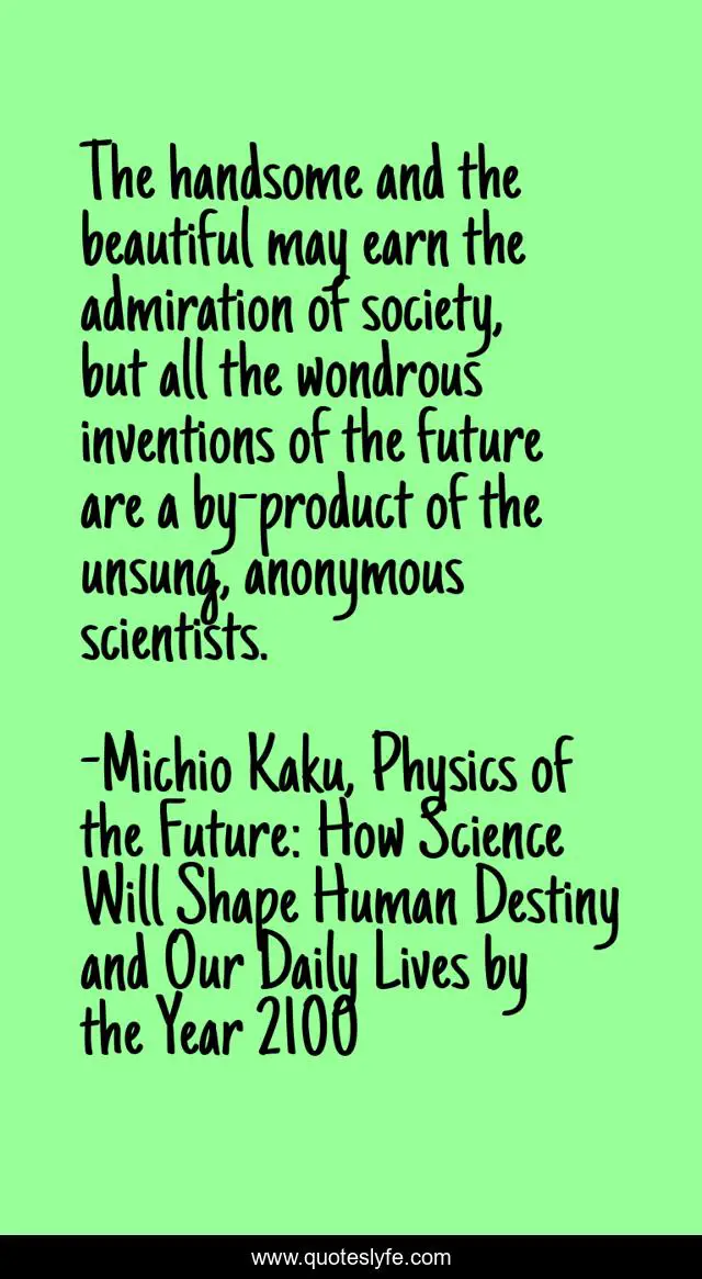 This page presents the quote "The handsome and the beautiful may earn the admiration of society, but all the wondrous inventions of the future are a by-product of the unsung, anonymous scientists.". Author of this quote is Michio Kaku, Physics of the Future: How Science Will Shape Human Destiny and Our Daily Lives by the Year 2100. This quote is about science, inspirational, enthusiasm,.