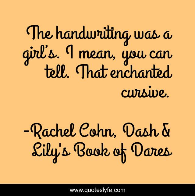 This page presents the quote "The handwriting was a girl’s. I mean, you can tell. That enchanted cursive.". Author of this quote is Rachel Cohn, Dash & Lily's Book of Dares. .