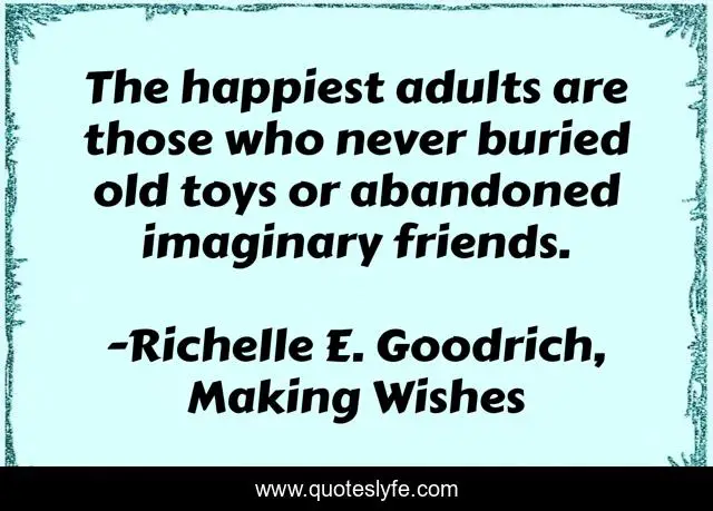 This page presents the quote "The happiest adults are those who never buried old toys or abandoned imaginary friends.". Author of this quote is Richelle E. Goodrich, Making Wishes. This quote is about adults, imaginary-friends, richelle-e-goodrich, happy-life, happy-adults, happiness, toys, richelle-goodrich, happy,.