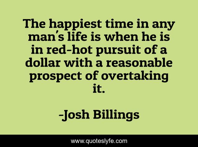 This page presents the quote "The happiest time in any man's life is when he is in red-hot pursuit of a dollar with a reasonable prospect of overtaking it.". Author of this quote is Josh Billings. .
