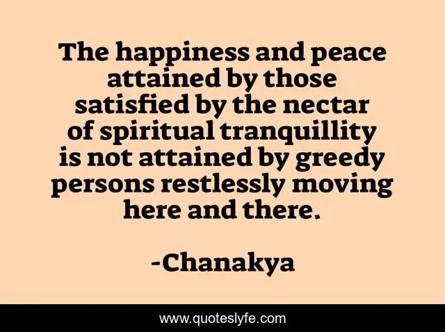 This page presents the quote "The happiness and peace attained by those satisfied by the nectar of spiritual tranquillity is not attained by greedy persons restlessly moving here and there.". Author of this quote is Chanakya. This quote is about spiritual, peace, moving,.
