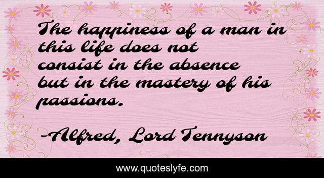 This page presents the quote "The happiness of a man in this life does not consist in the absence but in the mastery of his passions.". Author of this quote is Alfred, Lord Tennyson. This quote is about heart, passion,.