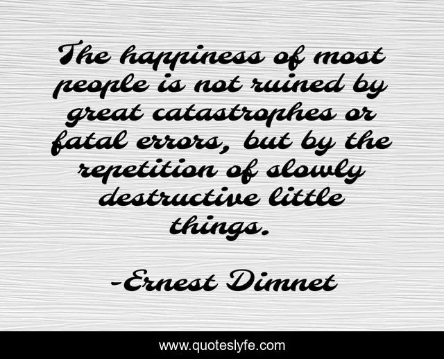 This page presents the quote "The happiness of most people is not ruined by great catastrophes or fatal errors, but by the repetition of slowly destructive little things.". Author of this quote is Ernest Dimnet. This quote is about great, little things, people,.