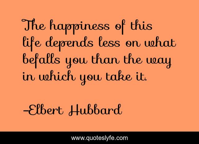 This page presents the quote "The happiness of this life depends less on what befalls you than the way in which you take it.". Author of this quote is Elbert Hubbard. This quote is about life, way,.