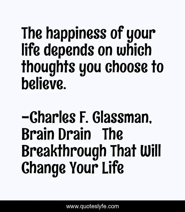 "Charles F. Glassman, Brain Drain The Breakthrough That Will Change Your Life Quotes." Quoteslyfe.com, 2025. Mon. 08 Dec. 2025. <https://www.quoteslyfe.com/quote/The-happiness-of-your-life-depends-on-201192>.