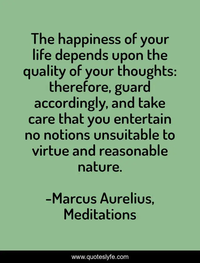 This page presents the quote "The happiness of your life depends upon the quality of your thoughts: therefore, guard accordingly, and take care that you entertain no notions unsuitable to virtue and reasonable nature.". Author of this quote is Marcus Aurelius, Meditations. .