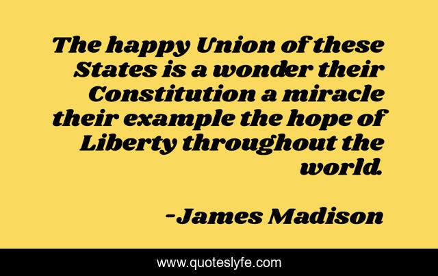 This page presents the quote "The happy Union of these States is a wonder their Constitution a miracle their example the hope of Liberty throughout the world.". Author of this quote is James Madison. This quote is about world, constitution, happy,.
