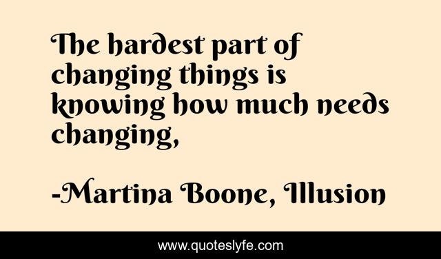 This page presents the quote "The hardest part of changing things is knowing how much needs changing, ". Author of this quote is Martina Boone, Illusion. This quote is about change-your-life, changes, change, change-the-world-for-the-better,.
