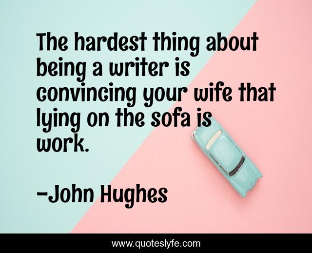 This page presents the quote "The hardest thing about being a writer is convincing your wife that lying on the sofa is work.". Author of this quote is John Hughes. This quote is about writers-on-writing, writing,.