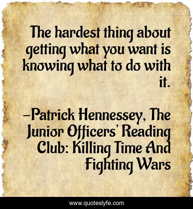 "Patrick Hennessey, The Junior Officers' Reading Club: Killing Time And Fighting Wars Quotes." Quoteslyfe.com, 2025. Sun. 07 Dec. 2025. <https://www.quoteslyfe.com/quote/The-hardest-thing-about-getting-what-you-215286>.