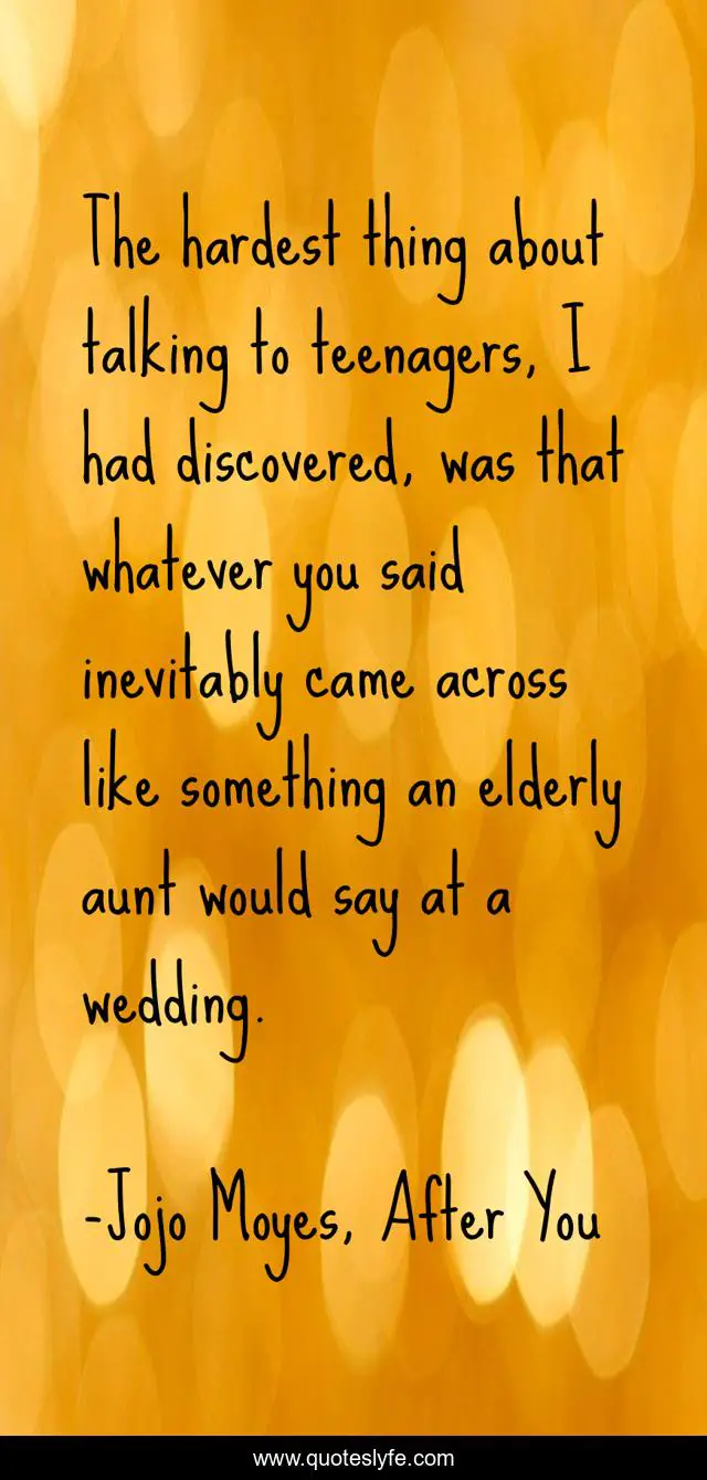 This page presents the quote "The hardest thing about talking to teenagers, I had discovered, was that whatever you said inevitably came across like something an elderly aunt would say at a wedding.". Author of this quote is Jojo Moyes, After You. This quote is about family-relationships, humor,.