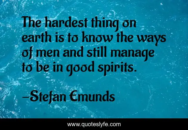 This page presents the quote "The hardest thing on earth is to know the ways of men and still manage to be in good spirits.". Author of this quote is Stefan Emunds. This quote is about life, wisdom, mankind, inspirational, enthusiasm, happiness,.
