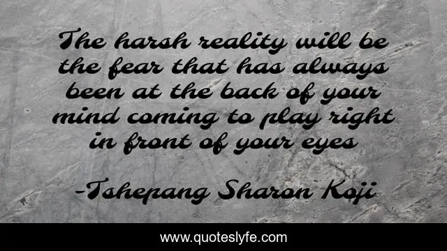 This page presents the quote "The harsh reality will be the fear that has always been at the back of your mind coming to play right in front of your eyes". Author of this quote is Tshepang Sharon Koji. This quote is about reality-of-life, separation,.