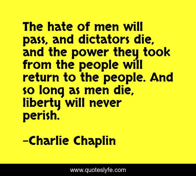 This page presents the quote "The hate of men will pass, and dictators die, and the power they took from the people will return to the people. And so long as men die, liberty will never perish.". Author of this quote is Charlie Chaplin. This quote is about men, hate, liberty,.
