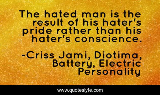 This page presents the quote "The hated man is the result of his hater's pride rather than his hater's conscience.". Author of this quote is Criss Jami, Diotima, Battery, Electric Personality. This quote is about conscience, narcissism, haters, insecurity, hate, arrogance, ego, hatred, pride,.