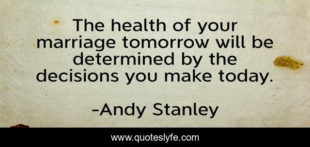 This page presents the quote "The health of your marriage tomorrow will be determined by the decisions you make today.". Author of this quote is Andy Stanley. This quote is about marriage-advice, decisions,.