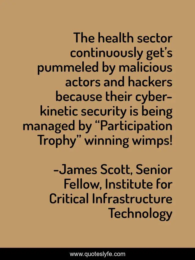 This page presents the quote "The health sector continuously get’s pummeled by malicious actors and hackers because their cyber-kinetic security is being managed by “Participation Trophy” winning wimps!". Author of this quote is James Scott, Senior Fellow, Institute for Critical Infrastructure Technology. This quote is about hackers, icit, health, james-scott, cyber-security, security,.