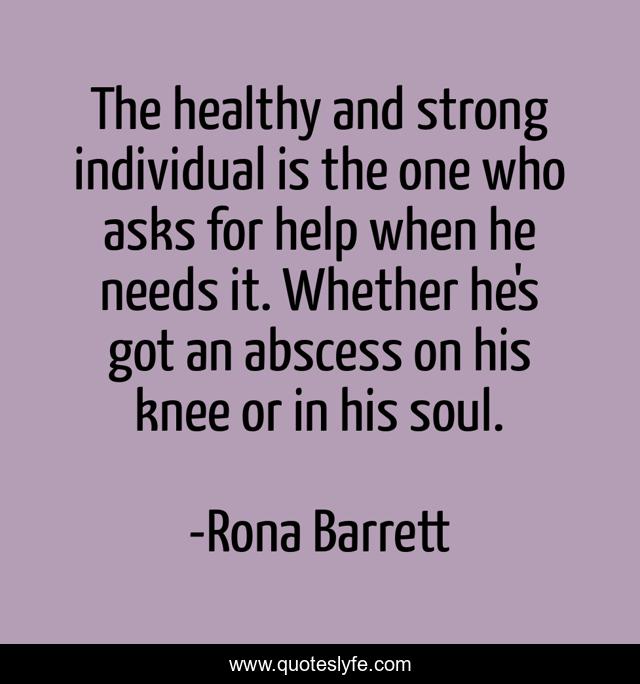 This page presents the quote "The healthy and strong individual is the one who asks for help when he needs it. Whether he's got an abscess on his knee or in his soul.". Author of this quote is Rona Barrett. This quote is about helping, people,.